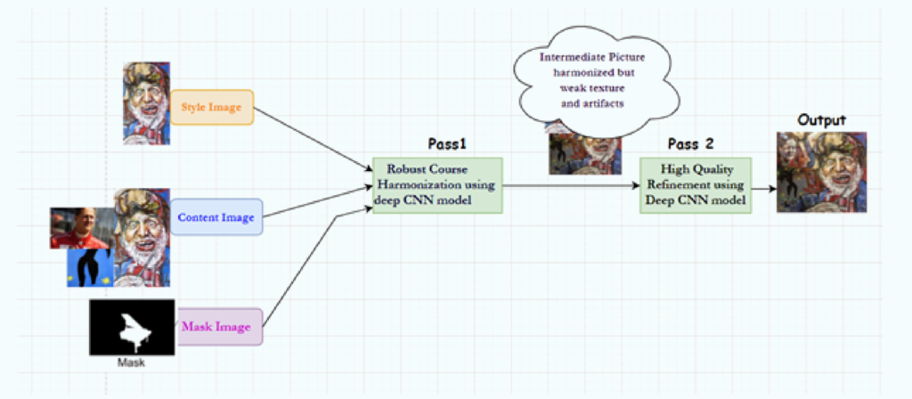 L’idée principale est de transférer les caractéristiques pertinentes de la peinture sur l’objet incorporé, puis d’améliorer davantage la qualité de la sortie. Pour cette approche, un mécanisme en deux passes peut être utilisé : première passe (Harmonisation grossière robuste) et deuxième passe (Raffinement haute qualité). La première passe consiste à réaliser la tâche d’harmonisation en effectuant une correspondance approximative des propriétés de couleur et de texture de la région collée à celles des régions sémantiquement similaires dans la peinture. La deuxième passe vise à améliorer la qualité du résultat obtenu à partir de la première passe. Fondamentalement, nous avons une image de style (peinture cible), et l’image de contenu comprend un élément d’une peinture à ajouter à l’image de style. Il y a aussi un plan pour utiliser l’image de masque (facultatif) de l’objet ajouté. L’image de masque est utilisée pour calculer les fonctions de perte uniquement pour cette partie de l’image. Mais l’image de contenu est-elle réalisée manuellement ou devrions-nous essayer avec la technique de composition d’images ? Nous devons découper et coller l’objet dans notre peinture cible, puis les envoyer avec une image de masque pour l’harmonisation d’images.